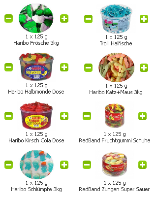 - Zuckerwaren, z.B. Bonbons, Brausepulver, Esspapier, Kaugummi, Gummibärchen..